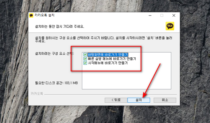 다음에 나오는 것은 설치하려는 구성 요소라는 것을 고르게 됩니다. 바탕화면에 카카오톡 바로가기 아이콘을 만들거나 윈도우 부팅시 자동으로 실행되는 것 등이 보이니 골라 주시면 됩니다.