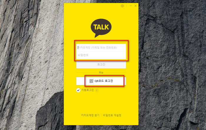 조금 뒤에 우리가 그렇게 원하는 카카오톡 pc버전 화면이 윈도우 바탕화면에 표시되게 됩니다. 이제 사용을 하려면 로그인 이라는 것을 해야하는데요. 방식은 크게 두가지를 지원합니다.