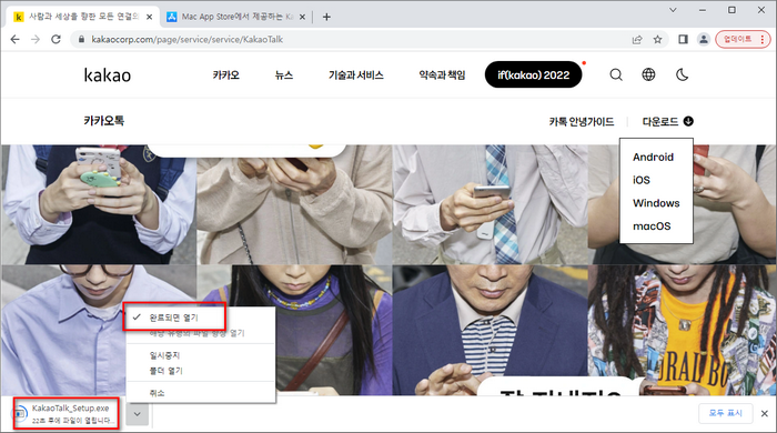 이를 선택하시면 자동으로 설치파일이 다운로드 되면 바로 실행까지 되기 때문에 완료되면 열기를 선택해두셔도 좋습니다.
