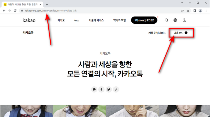 제가 알려드린 카카오톡 pc버전 다운로드 페이지에 들어가보시면 화면을 잘보셔야 합니다. 이미지에 그려둔것과 같이 오른쪽 상단에 다운로드라는 문구가 있다는 것이 보일꺼에요. 이것을 클릭해보도록 하겠습니다.