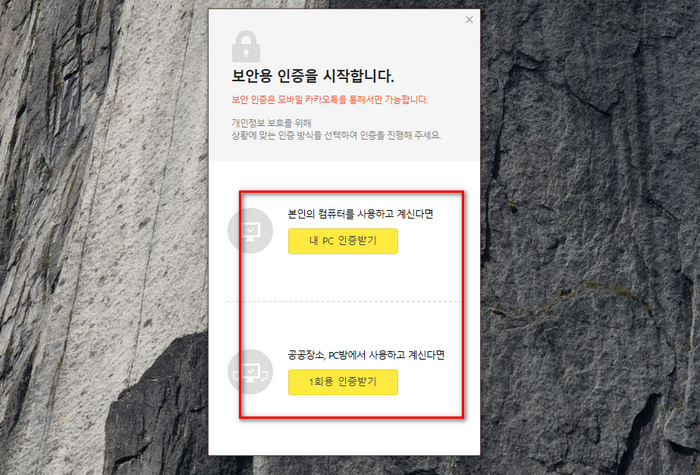 만약에 현재 카카오톡 pc버전 다운로드를 받았던 컴퓨터가 나만 쓰는 것이 아니라면 무조건 "1회용인증"을 진행해야합니다. 실수로 자동 로그인까지 설정되면 아무나 여러분 아이디에 접속이 되기때문이죠.