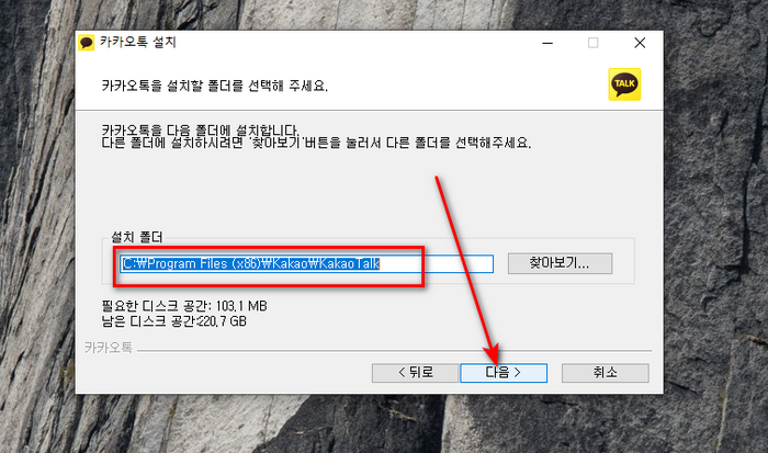 카카오톡 pc버전이 어디에 설치 될지 경로를 지정하는 화면이라고 합니다. 필요한 디스크 용량은 약 103MB정도 되는데 변경은 "찾아보기"라는 메뉴를 골라서 진행합니다.