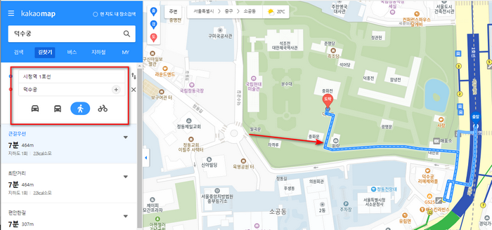- 길찾기: 여러 맵서비스랑 마찬가지로 출발지와 목적지를 입력하여 우리가 일상에서 이용할 수 있는 교통수단(자동차, 버스, 지하철)의 최적 경로를 알려줍니다.