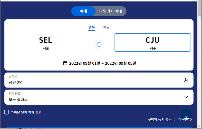 2. 왕복 또는 편도를 고르시고 출발일자와 도착일자를 선택해주세요.